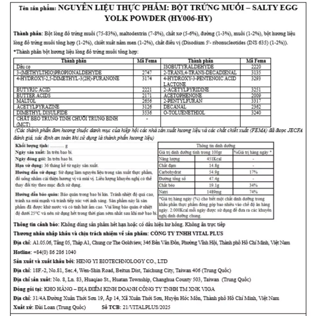 Thành phần: Bột lòng đỏ trứng, xơ, maltodextrin, muối, hương, đường, chiết xuất men, I+G