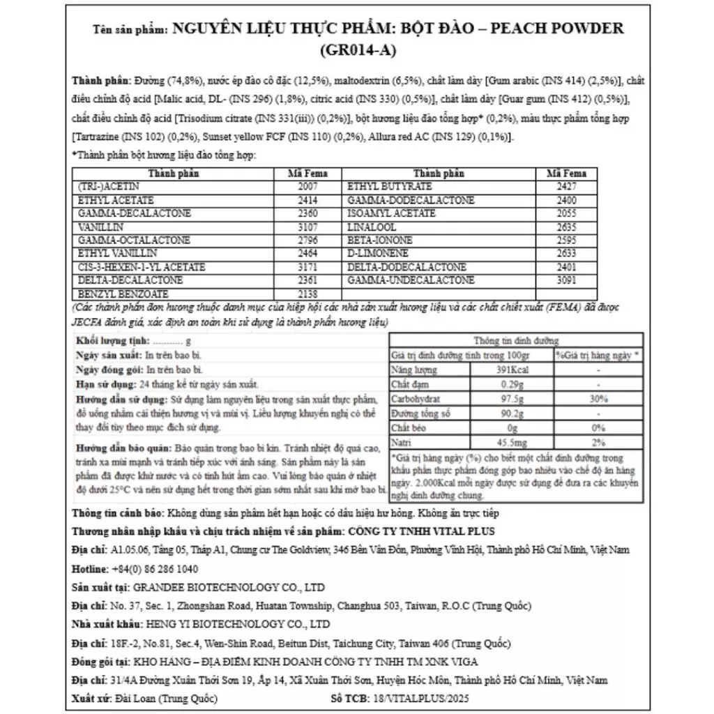Thành phần: Đường, nước ép quả đào cô đặc 5% maltodextrin, gum Arabic (INS4140, guar gum (INS4120, chất điều chỉnh độ acidL: (acid citric, acid malic), trisodium citrate (INS331iii), hương liệu tổng hợp, màu thực phẩm: Tartrazine (INS102), Sunset Yellow (INS110), Allura red (INS129)