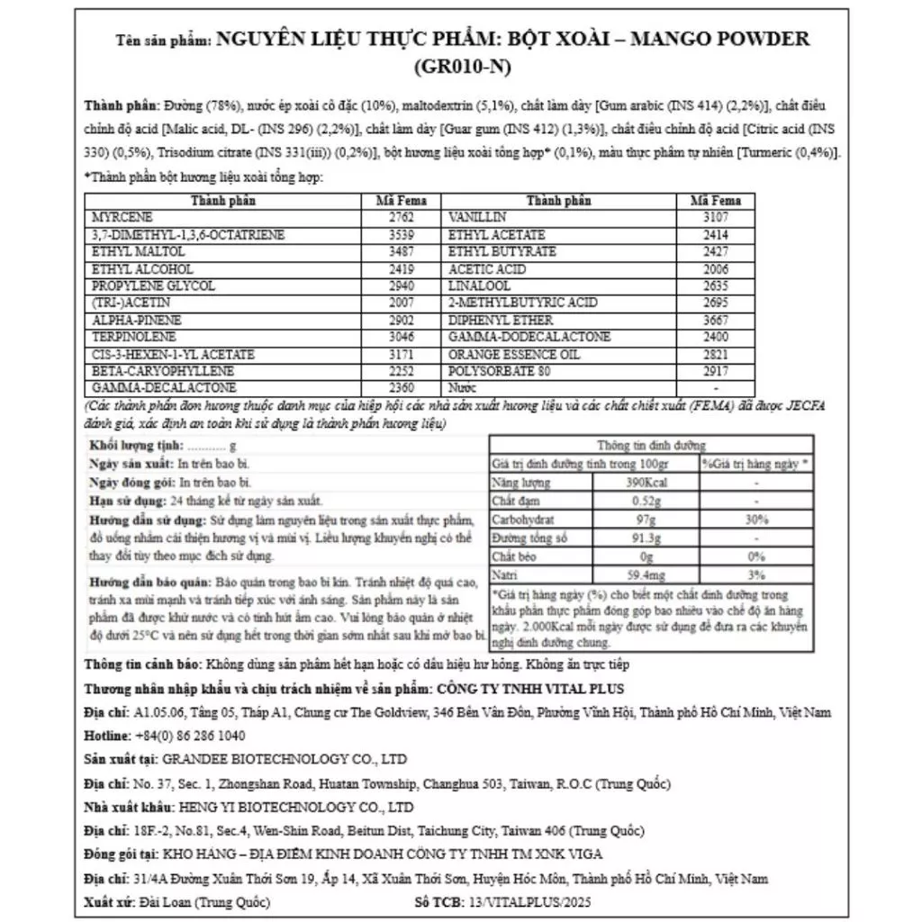 Thành phần: Đường, gum arabic (INS414), maltodextrin, nước ép xoài cô đặc, citric acid (INS330), DL-malic acid (INS296), Sodium citrate (INS331i), Guar gum (INS412), hương liệu tổng hợp, màu thực phẩm: Curcumin (INS100i).