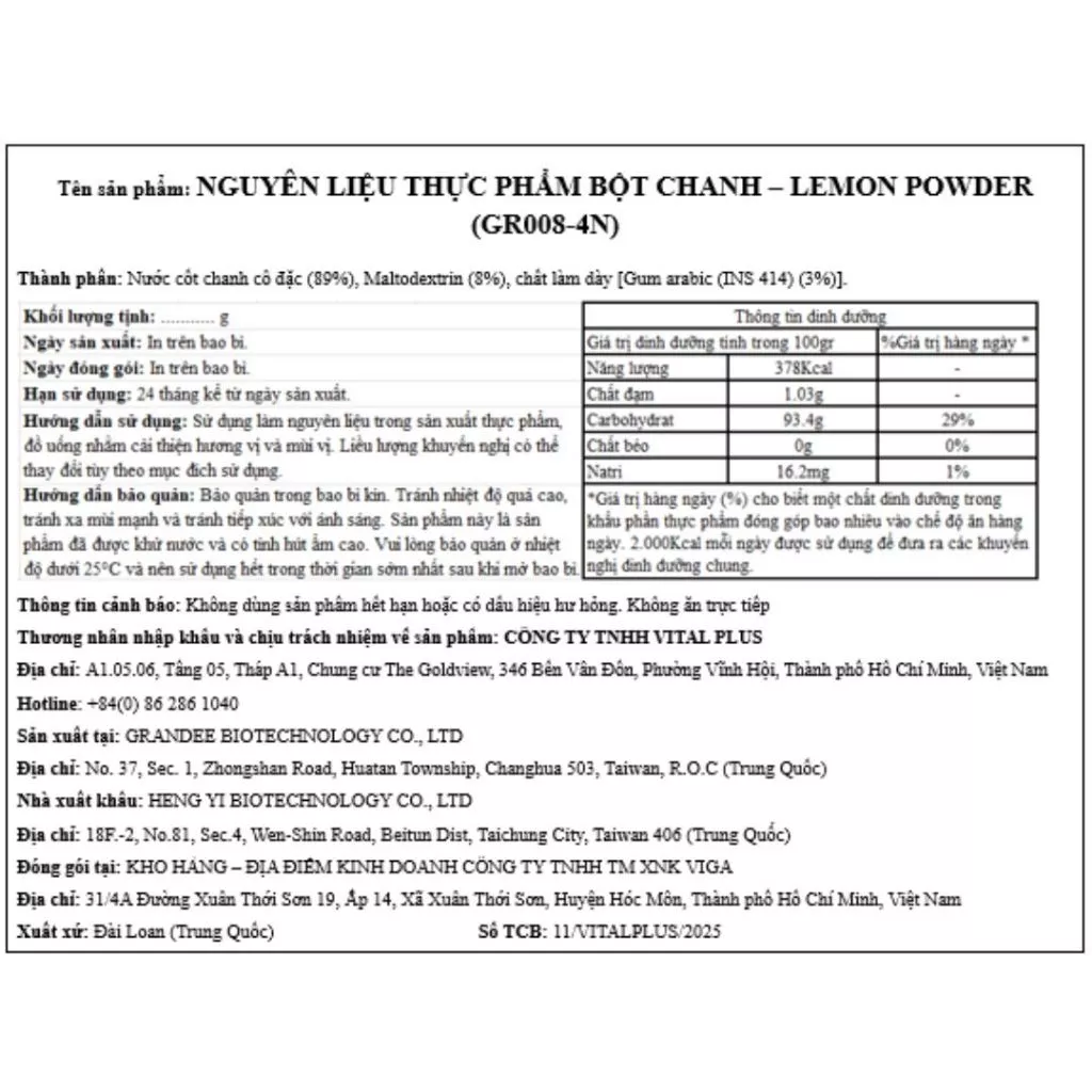 Thành phần: Maltodextrin, nước ép trái chanh, Gum Arabic (INS 414)