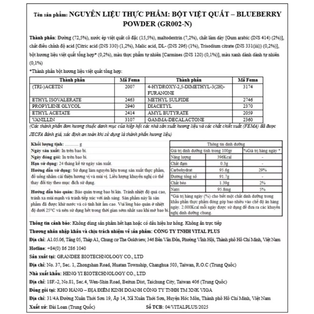 Thành phần: đường, maltodextrin, nước ép việt quất cô đặc 5%, chất điều chỉnh độ acid: (acid citric, adcid malic), chất làm dầy: gôm arabic, hương liệu tổng hợp, phẩm màu (màu từ cây dành dành, carmin), chất chống oxy hóa: tartaric acid, chất ổn định: trinatri citrate.