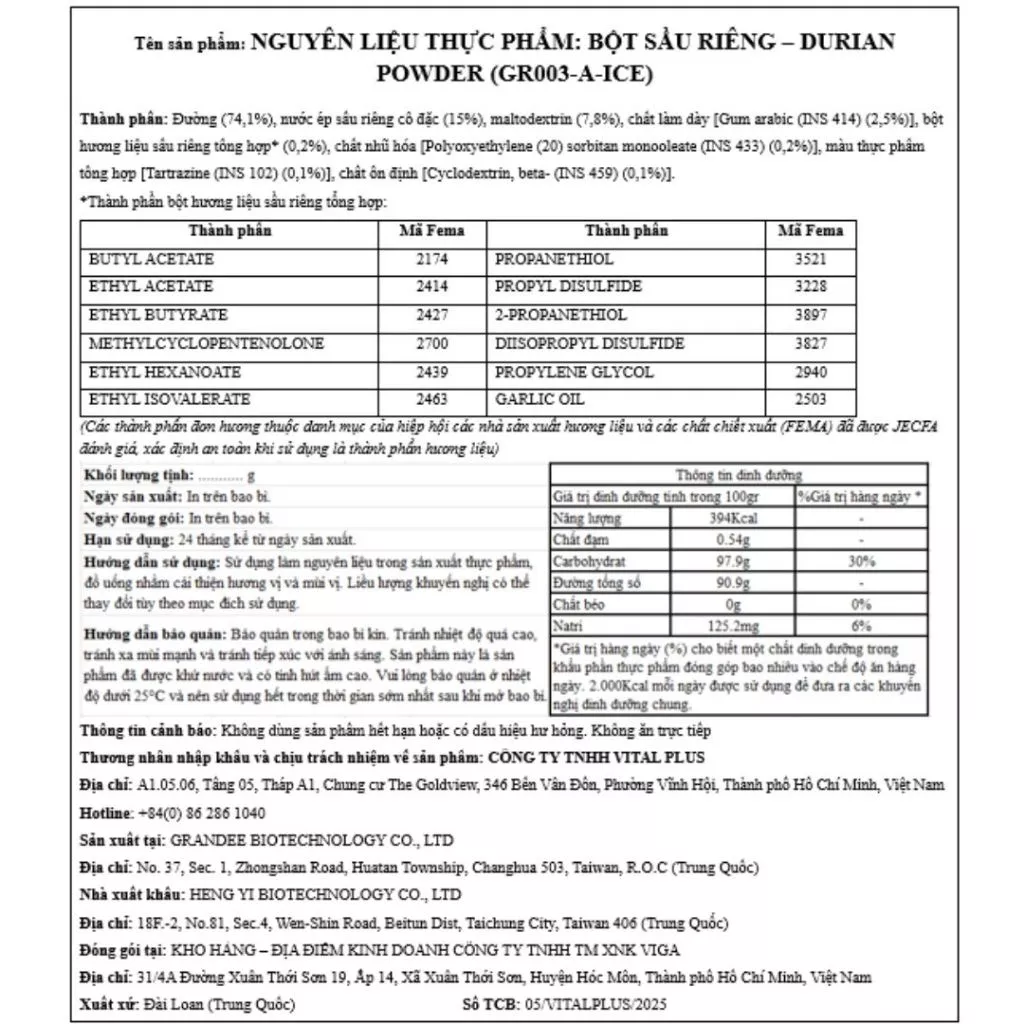 Thành phần: đường, Maltodextrin, 10% nước ép quả sầu riêng, gum Arabic (INS414), hương liệu thực phẩm, màu Tartrazine (INS102), cyclodextrin (INS 457), Polysorbate fatty ester eighty (INS433)