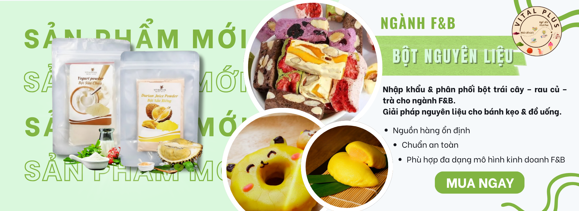 Công Ty TNHH Vital Plus chuyên nhập khẩu, phân phối bột trái cây, rau củ, bột trà và các loại bột cao cấp phục vụ sản xuất bánh kẹo, đồ uống và ngành F&B. Cam kết chất lượng, đa dạng sản phẩm, sẵn sàng đồng hành phát triển cùng doanh nghiệp của bạn!