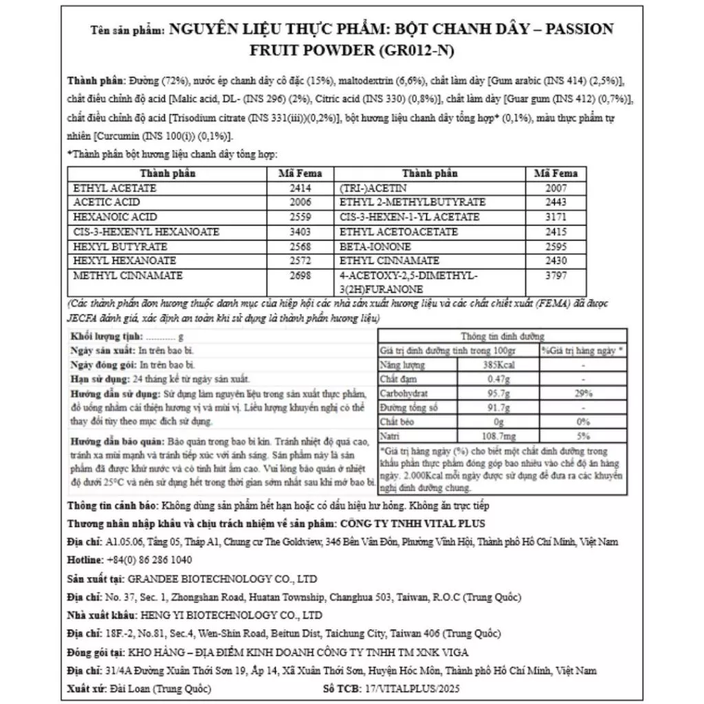 Thành phần: Đường, nước ép chanh dây, maltodextrin, gum Arabic, guar gum, chất điều chỉnh độ acid, citric acid anhydrous, trisodium citrate, hương thực phẩm, màu thực phẩm: curcumin