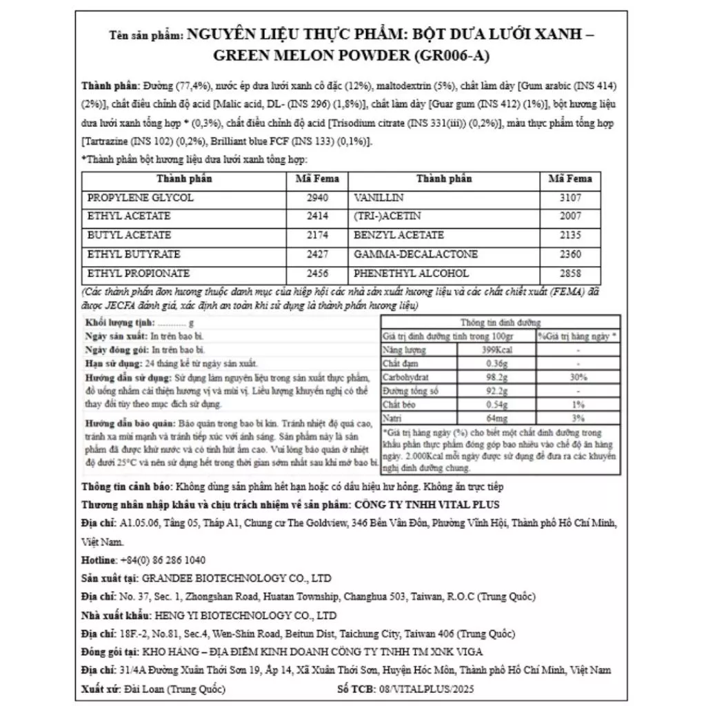 Với thành phần từ cốt dưa lưới xanh thật được chế biến bằng kỹ thuật sấy phun độc đáo, kết hợp cùng hương và màu tự nhiên, Bột Dưa Lưới vẫn lưu giữ được hương thơm và vị ngọt đặc trưng cùng các chất dinh dưỡng có trong quả tươi.